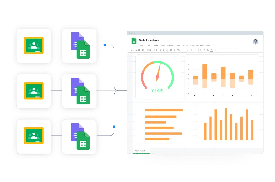 For a completely automated system, try Sheetgo’s attendance management workflow template. The teacher fills out their own Google Sheet, marking which students are present or absent at each class using the tick boxes and dropdown menus. Each teacher’s spreadsheet is connected to the administrator’s master sheet, via Sheetgo connections. The data flows automatically from the teacher’s spreadsheet to the administrator’s spreadsheet, giving school managers an instant overview of attendance across the school, without the need for emails or calls.
